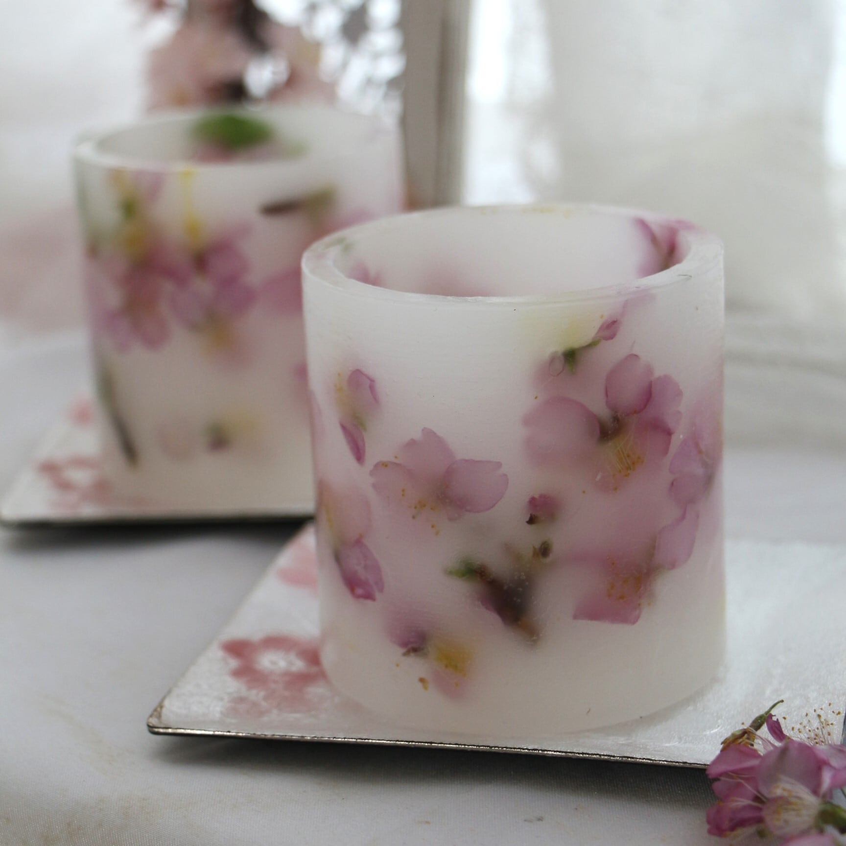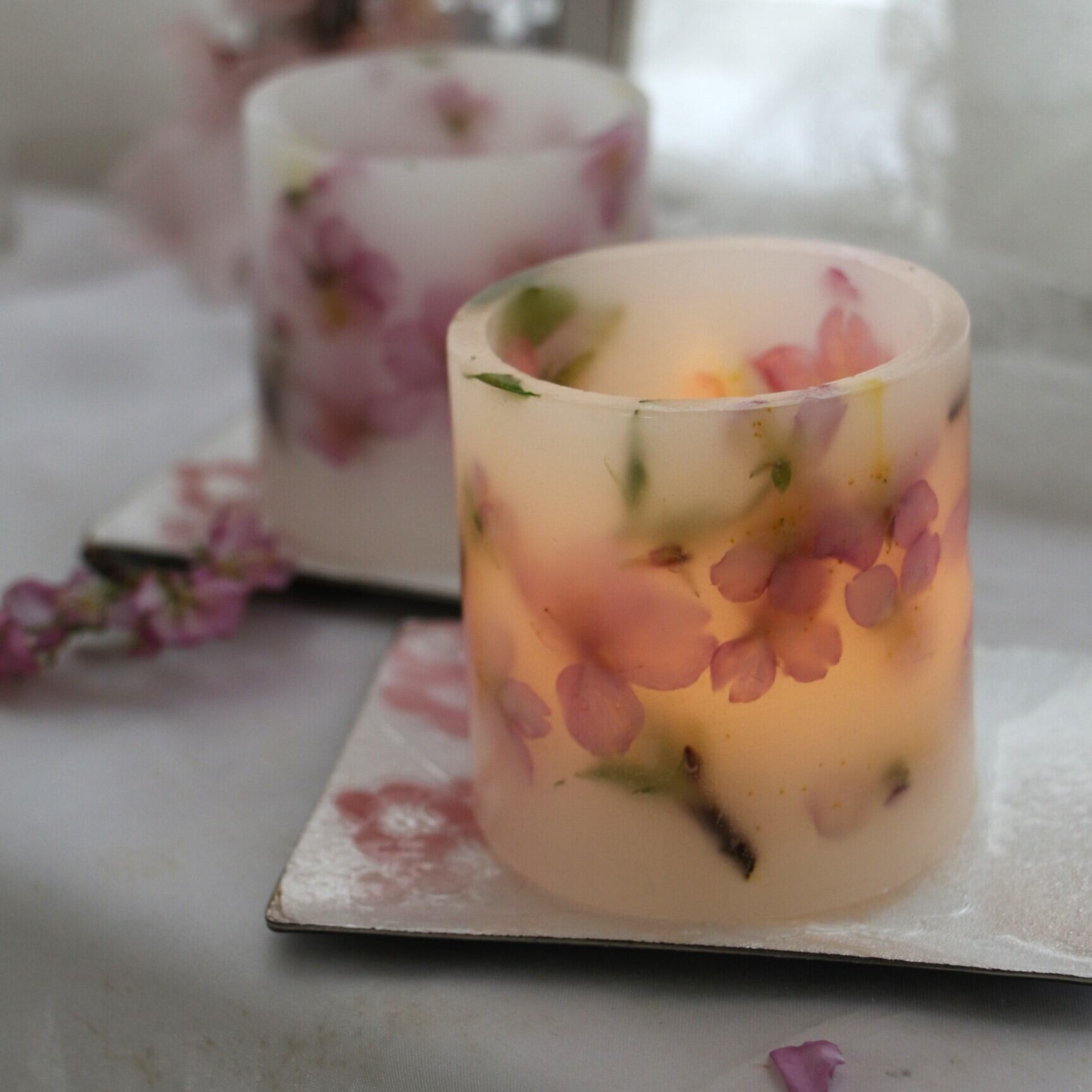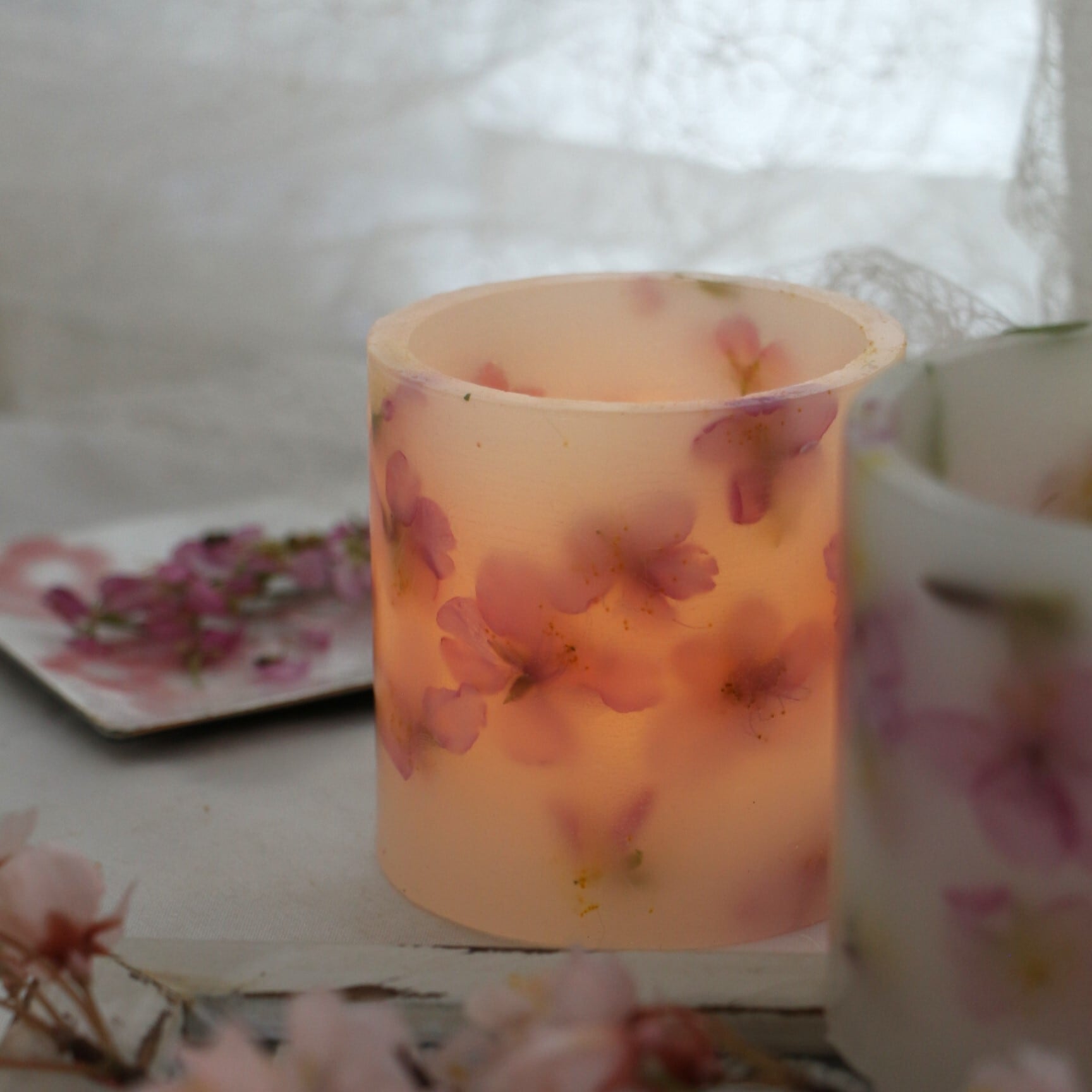 桜の美しさをそのままにした、魅力的なランタンです。蝋で作られた本体には、繊細な桜があしらわれており、見る人を惹きつけます。内にはLEDライトを灯します。優しい光で火を使わず、安心安全です。